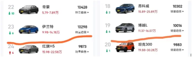 我们以燃油车为条件来划分,在轿车细分市场,一共有23款车型在6月销量在1万辆以上。北京现代伊兰特6月销量达到10298辆,排名第23名,一定很出乎大家意料;而在SUV细分市场,一共有19款车型6月销量在1万辆以上。