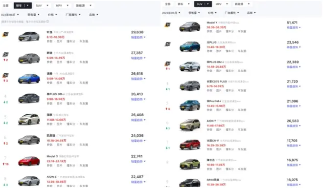 我们以新能源汽车为条件划分,在轿车细分市场,一共有11款车型销量在6月份销量在1万辆;在SUV细分市场,有7款车型6月销量在1万辆以上。