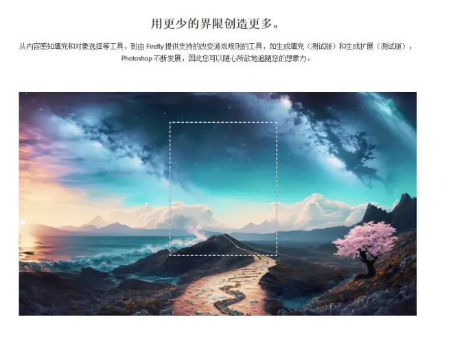 在Photoshop测试版中,需找到页面侧边“裁剪工具”点击,将图片两侧进行拉伸,随后利用“矩形选框工具”对拉伸图片完成拓展,右键点击后找到“生成式填充”按钮,随后,PSAI功能就会自动根据当前图片图像生成两边的图像,并将其填充至图片拉伸区域中。