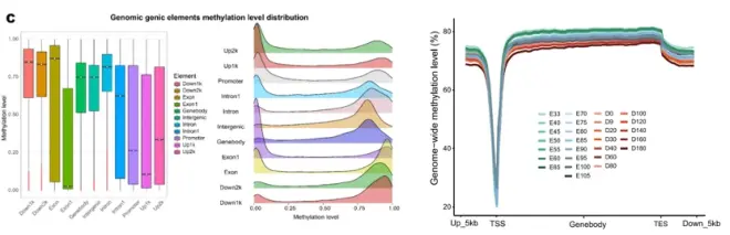 不同基因组元件(CGI相关元件、重复序列元件、基因元件等)的甲基化水平分布规律不同。特别是在不同物种中,基因元件的甲基化水平可能有一定的特点。