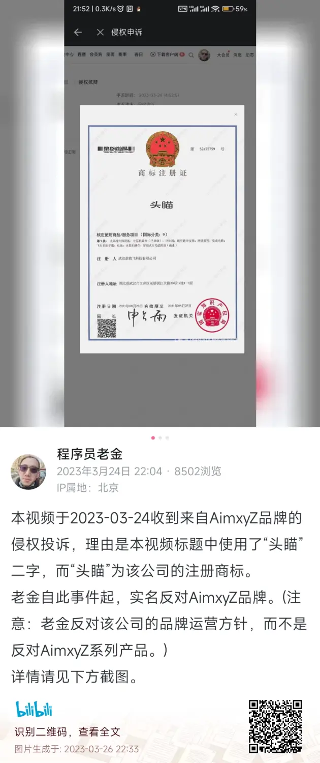时隔5个月,于2023年3月24日,上述第一期测评视频收到了来自AimxyZ品牌方的投诉,理由为“该视频标题,擅自使用了我方享有权利的商标”,并附上商标注册证明。