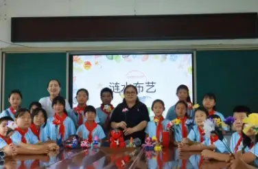 9:30,在志愿者们引导下,同学们排成一字型安静有序的回到徐集中学开始了非物质文化遗产,“涟水布艺”的课程。从一针一线的梳理开始,刚上课,每个同学就很快投入进来。梳理完材料,老师开始一步一步具体的演示如何将线穿针并打结,如何用用针线一点一点的将花布串连。再演示结束后,同学们自己操作,老师下来给一组一组的同学不断耐心教导。学会的同学立即再次动手尝试。不会的同学也会积极询问已经学会的同学,同学们互帮互助,在下课时每个人都完成了自己的第一个涟水布艺作品