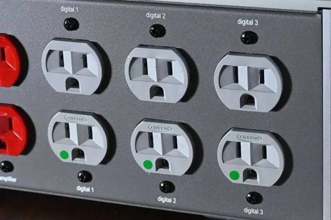 机身上会有为数码、模拟、放大而设的插头,白色是为唱盘、模拟前级等而设的供电,Reference 系列会有直接的「analogue」标示。插头上的绿点表示为 Hospital Grade 医疗级,质量更高也更可靠。