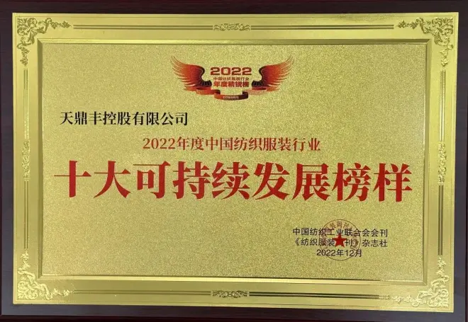 天鼎丰荣获2022年度中国纺织服装行业十大可持续发展榜样