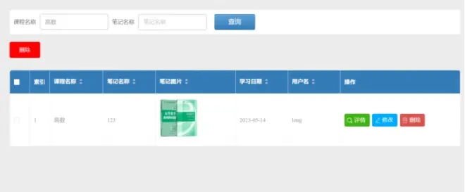 为了提高对学习笔记的管理效率,在管理员管理页面功能中有一个学习笔记管理模块,管理员可以对学习笔记进行查看、搜索和修改以及删除等,管理员可以对学习笔记进行增删改查等操作,其中学习笔记的查看时调用的xuexibijiController类里的page方法,用 list方法查询数据库里面保存的数据并通过学习笔记管理中查看所有学习笔记信息界面展示出来。查询时是通过的学习笔记id,通过xuexibijiController里的selectById对数据库中存在的id进行查询,将查询结果显示出来。学习笔记管理界面如图 5-6 所示。