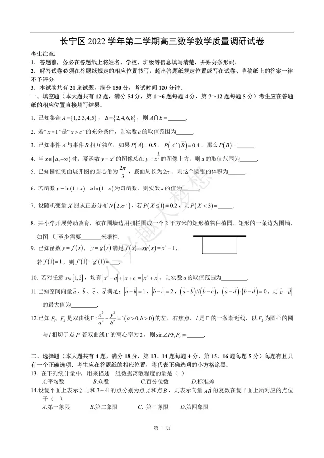 2023届青浦区高考数学二模(答案)