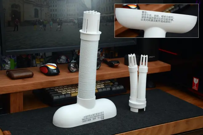 T型导风管,中间是伸缩管,接口采用磁吸附设计,侧面印有警示标语,干衣、烘鞋、暖被功能时,务必通过遥控器打开相应模式避免对机器和配件造成损坏。烘鞋管同样采用伸缩管设计,拉伸后基本上可以满足一般的鞋子或靴子使用。