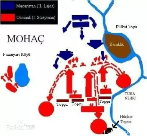 (四)苏莱曼大帝围攻彼得沃登(7月12-27日)持续了两个星期,为拉约什二世召集部队赢得时间,这位国王很早就意识到奥斯曼人的威胁,并体现出可观的动员手腕。拉约什二世暗地里集结军队,随后开赴南方的莫哈奇地区,在那里他的军队增加到1.2万名骑兵和1.3万名步兵(8月15日)。此时谣传苏莱曼大帝的军队有30万人,使拉约什二世和他的一些谋士极为恐慌,但是机智的勇士托莫里大主教正确判断土军的力量,充分地分析土军的作战能力,指出土军的实际作战兵力有限,拉约什二世被这一论证折服。匈军所选择的战场是多瑙河下游一片广阔但崎岖的平原,那里有一些沼泽地。土军之前几乎没有遇上任何抵抗,当拉约什二世在布达等待开战的时候土军已经围攻数个城镇并越过萨瓦河和德拉瓦河。于是拉约什二世集合2.6万名士兵,这时土军的战斗力量则有6万人。匈军列好阵势,希望以地理上的优势将土军逐个击破。1526年8月28日苏莱曼大帝率军来到达莫哈奇平原的南边,他的轻骑侦察队发现匈军正在莫哈奇西南部平原的中心地带备战。1526年8月28-29日匈军在莫哈奇前组成三个大的方阵,左翼处在多瑙河流域的一片草地,其中未部署兵力。步兵中部署在中间方阵的前面,并编入大量的火枪手和炮兵(20门火炮)。重骑兵分队放置在三个方阵中间,其余的骑兵撤到防线后部作为预备队。苏莱曼大帝将自己的军队排列成三个横队,前面的两个横队是由亚洲各国的轻骑兵联合构成,在它们后面为骑兵机动留下一块地方。他将雇佣军和炮兵放在阵前,非正规骑兵放在两翼。6000人的亚洲各国轻骑兵分遣队被派出迂回到西面,利用起伏的山丘做掩护,计划当双方军队全面投入战斗时突袭匈军的右侧。同样熟悉巴尔干环境的鲁梅利亚军团迅速向左翼的广阔空间展开,身后的近卫军步兵开始迅速构筑简易阵地,计划执掌右翼的安纳托利亚军团则在他们之后才开始部署兵力。由于附近遍布沼泽奥斯曼人的行军非常费力,但复杂的地形也影响匈军的侦查水平。