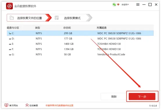 Sept1:打开金舟数据恢复软件,进入软件页面选择想要恢复数据的硬盘位置,进入“下一步”;