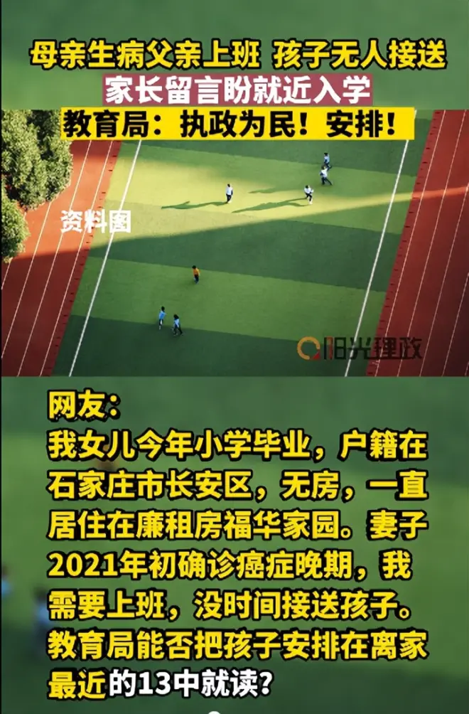 据阳光理政的消息,石家庄有个网友反映,自己的家庭情况是这样的,女儿小学毕业,户籍在石家庄长安区,家庭经济不好,没有房子,一直居住在廉租房富华家园。而妻子还在2021年初确诊为癌症的晚期,花费很大,他肯定要每天都在上班赚钱,养家糊口。而孩子就没人接送了。这个家长期望能够把孩子安排在距离家比较近的石家庄市13中就读。