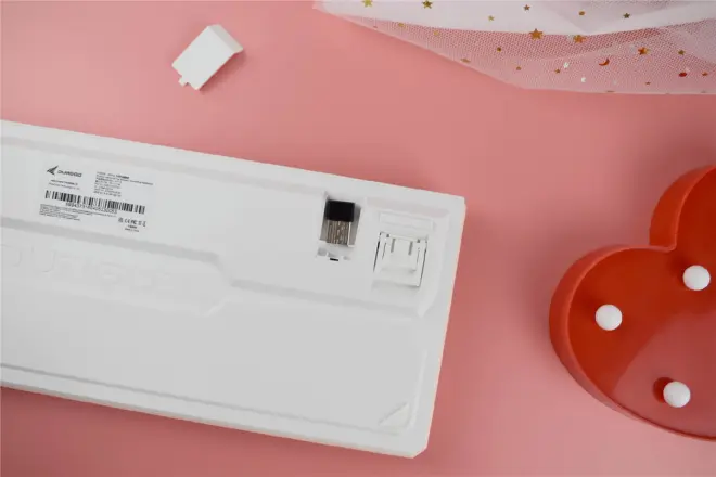 隐藏式接收器收纳仓,可以妥善保管好2.4G接收器,虽然丢失的情况很少出现,还是应该防范于未然,有保护盖能够让人更放心些,偶尔携带键盘外出时也方便些。