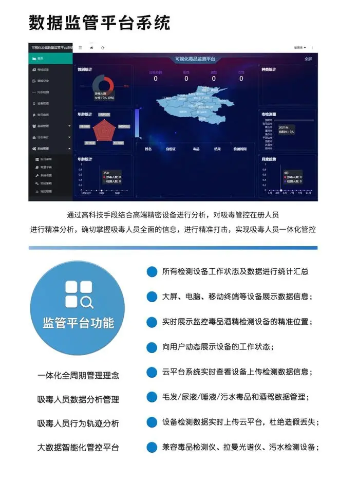 采用一体化解决方案:样本(毛发、唾液、尿液、酒精、污水) +仪器+后台系统数据库形式,结合领先的人工智能技术以及优越的光学设计,后台监控中心实时掌控数据动态和多维度大数据分析,以便形成更加精准的应对策略。