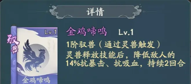 灵兽释放技能后,降低敌人的14%暴击,抗吸血,持续两回合。