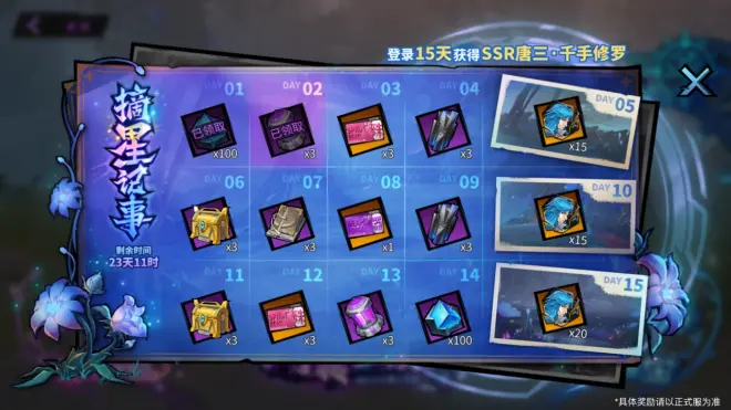 在星罗大森林中,跟随唐三和小舞的脚步一起探寻所见所闻。每日登录游戏签到,即可通过【摘星记事】获得签到奖励一份!还可合计获得「灵魂碎片·千手修罗」*50,即签到15天获得SSR「唐三·千手修罗」!