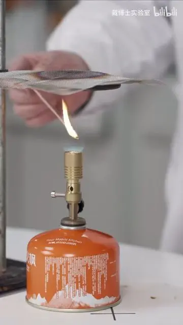点火气体开始燃烧,放热,下面的气体燃烧,但是那个铁丝网是一个很好的热导体,所以热量达到铁丝网它分散,所以上面的气体还没有加到它的着火点,所以没有开始燃烧