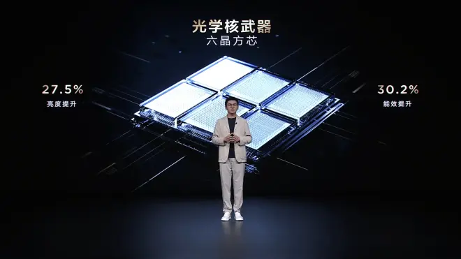 峰值亮度是画质的核心指标,峰值亮度越高,细节越清晰,场景还原越真实。TCL采用堪称“核武器”级别重大突破的Mini LED六晶方芯,发光点由2个升级为6个,亮度提升27.5%,控得住亮暗,拿得住细节;在六晶方芯上,TCL又采用行业首创“控光灯塔”级别的光学影像微透镜,精准控制光线走向,均匀性和稳定性大幅提升,并有效解决电视行业长期遇到的光晕难题。