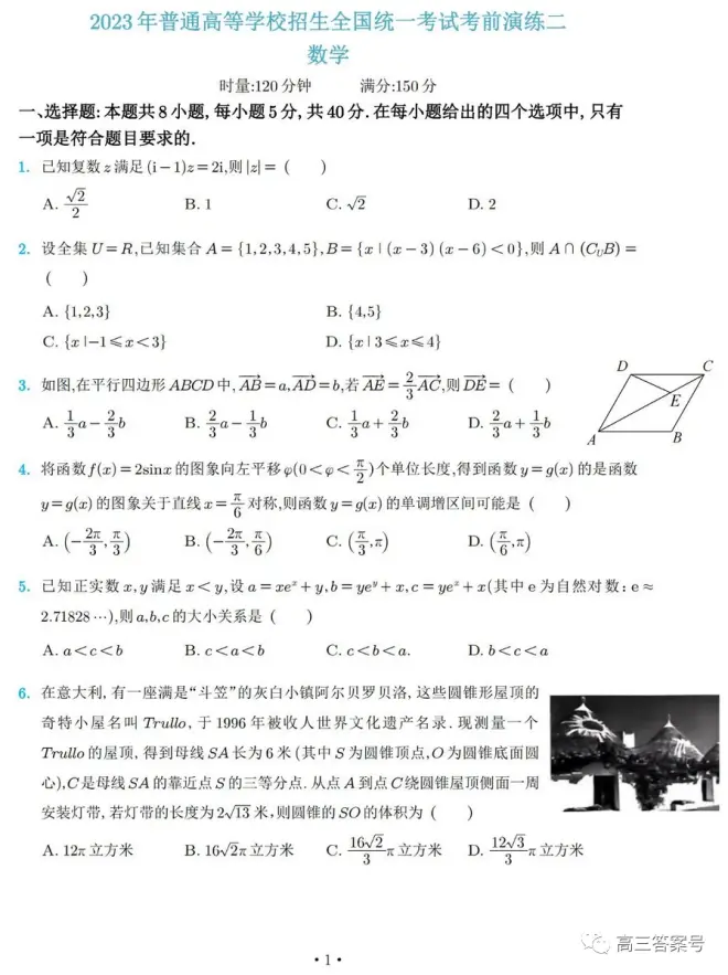 » 2023年普通高等学校招生全国统一考试考前演练二
