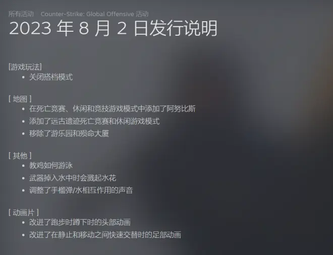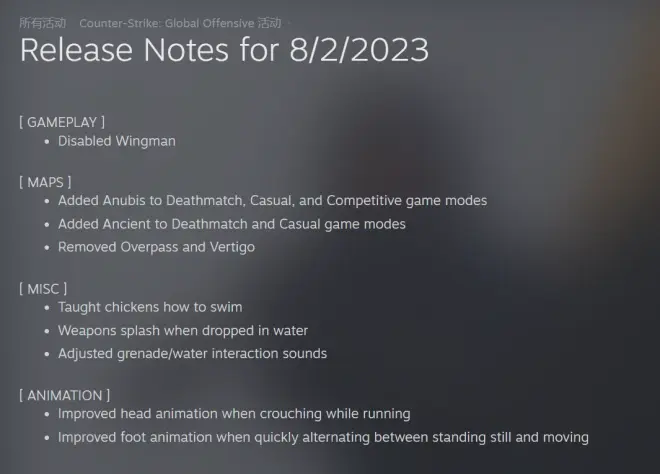 阿努比斯&远古遗迹登入CS2,小鸡新增游泳技能 或将实装眼球系统