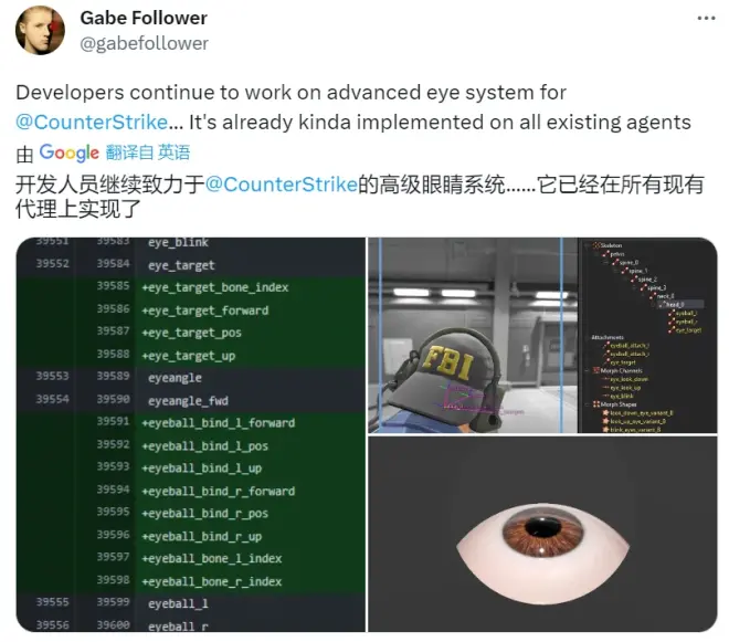 此外,游戏挖掘者还发现,CS2已完成眼球系统,在不久的将来,将会实装到CS2