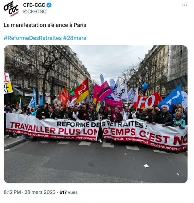 2023年3月28日周二,在八大工会的号召下,法国人又展开了第10轮反对退休改革的罢工运动。