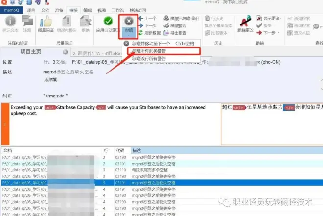 通常情况下,其实在翻译的过程当中就会帮你去运行QA,进行实时质量检查。前面我也跟大家建议过,遇到QA问题时,要么修改为正确的,要么忽略~