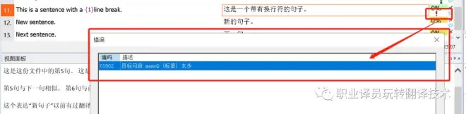 前面我们已经制定好了 QA 规则,在翻译的过程中,译员如果触发了 QA 的问题,memoQ会自动进行问题提醒,这些问题包括:缺少行内标签、存在多余的空格、缺少数字、术语不一致等。