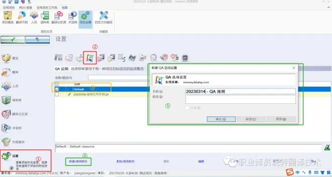Step 1:点击 ④"新建/使用新的" -> 弹出 "新建 QA 选项设置" 窗口 -> ⑤ 输入 QA 名称,点击"确定"。