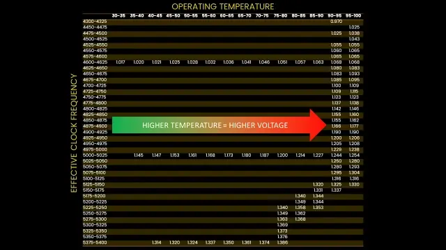 曲线优化器偏移电压-频率-温度表,在给定频率-温度点强制降低电压,从而能够在给定电压下提升到更高频率