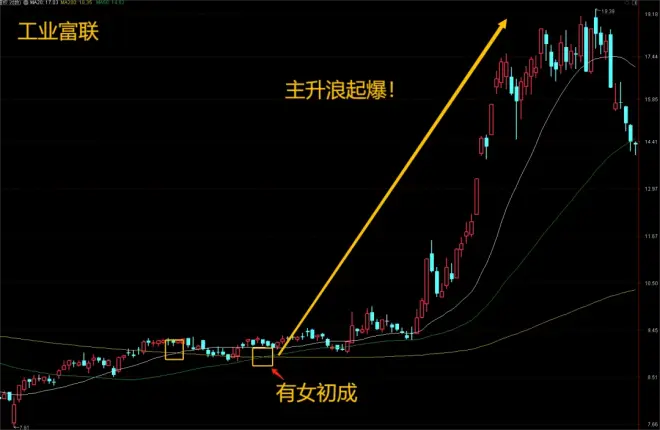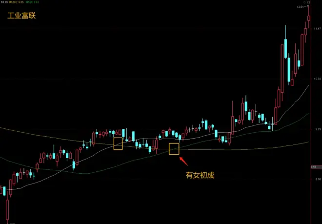 20均线与50均线的穿越形成了一个“女”字。此时就是“有女初成”。
