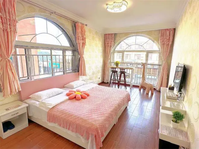 浪漫情侣大床房和粉色大床主题房,特别适合情侣住宿。落地阳台,因为位置是在临街站在阳台上可以把热闹的夜市一览无余,晚上吹着凉凉的风,惬意极了,而且房间的卫生也很干净,很温馨真的棒极了。
