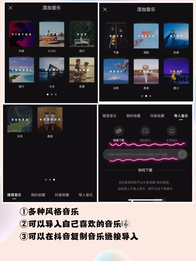 第8步:点击添加音频有很多类型的音乐也可以导入本地音乐也可以从其他平台复制音乐链接,要做卡点视频可以点击自动踩点或手动踩点确定卡点