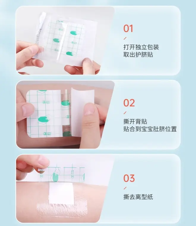使用婴儿护脐贴时,首先需要用温水清洁宝宝的脐带区域,然后晾干,再将护脐贴轻轻地贴在宝宝肚脐上即可。在贴护脐贴前,家长还需要检查宝宝的脐带是否异常,如出血、红肿等,如有异常情况应及时就医。