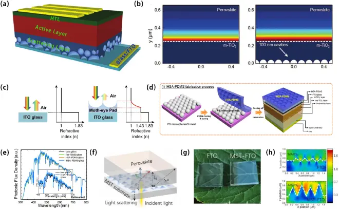 2、从光学结构设计的角度总结了通过减少光散射和促进光子吸收等调控钙钛矿太阳能电池效率的手段;