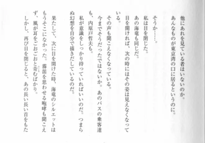 果然、接下来睁开眼时、海龙的轮廓已然不在那里。使人联想到雾笛的咆哮也听不到了、只有风咯咯地折磨着耳朵。