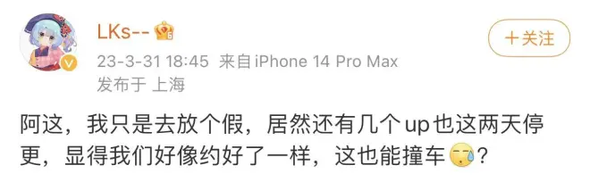 两天前他也曾敏锐地观察到,“还有几个UP也这两天停更,显得我们好像约好了一样”,并重申:“我只是去放个假”。