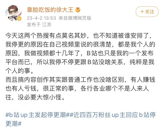 “靠脸吃饭的徐大王”带话题回应称:“今天这两个热搜有点莫名其妙。我停更的原因在自己视频里说的很清楚,都是我个人的原因,我做视频都十几年了,B站也只是我的一个发布平台而已,所以我停不停更跟B站没啥关系,纯粹是我个人的事。而且搞内容创作其实跟普通工作也没啥区别,有人赚钱也有人亏钱,很正常的事,各行各业哪个不是人来人往,没必要大惊小怪。”