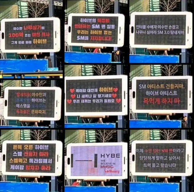 这些卡车上装有LED广告牌,上面反复播放着类似“HYBE已然获得了巨额财富,不要伤害SM。”不要因为收购SM而破坏韩流文化”、“我们支持没有HYBE的SM”等口号。对于这种示威活动,网友的反应褒贬不一。有网友批评说:“让人感到很尴尬”、“真的需要这么做吗?”另一方面,也有网友表示理解:“从粉丝的角度来看,他们能做的不多,所以只能这样做”、“我可以理解他们的心情”等。