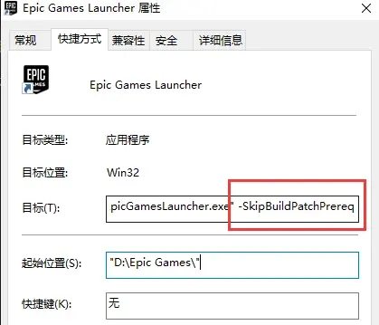 4,如果还是不行,将Epic Games Launcher快捷方式的目标值复位成原来的内容(即删掉-SkipBuildPatchPrereq)