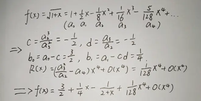 如果想进一步增强近似程度,很容易想到引入两个一次分式或者一个二次分式。但如之前说的,手算二次比较麻烦了,因此这里考虑引入两个一次分式。但先概括一下:此时系数往往是极其无理的,并不有利于计算。只有少数函数可以采取这种方法