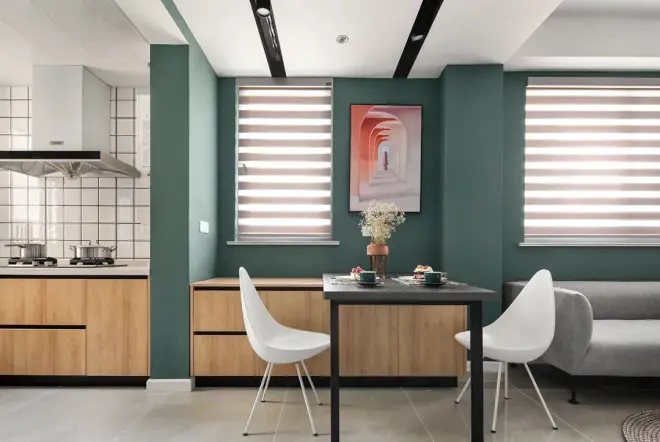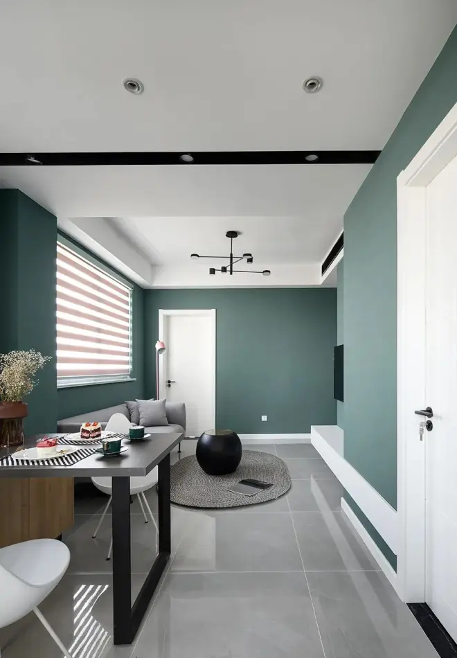 ▲面积比较小的基础,整个客厅铺上灰色地砖+蓝绿色的墙面,餐厅与客厅一体的空间,简洁舒适而文艺自然。客厅地面铺上圆形地毯,摆上黑色小茶几,沙发后方窗户加入百叶帘,让室内空间私密而又时尚明亮。