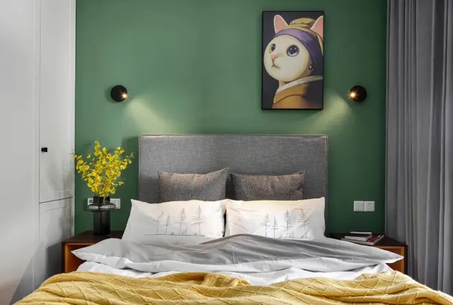 ▲卧室床头墙以墨绿色的背景墙基础,挂一幅猫头装饰画,略显可爱俏皮,两侧装上简约的黑色小壁灯,中间布置灰色布艺床铺,左右两侧布置床头柜,床头柜上的跳舞兰与黄色床单相呼应,增添了空间的温馨与活力感。