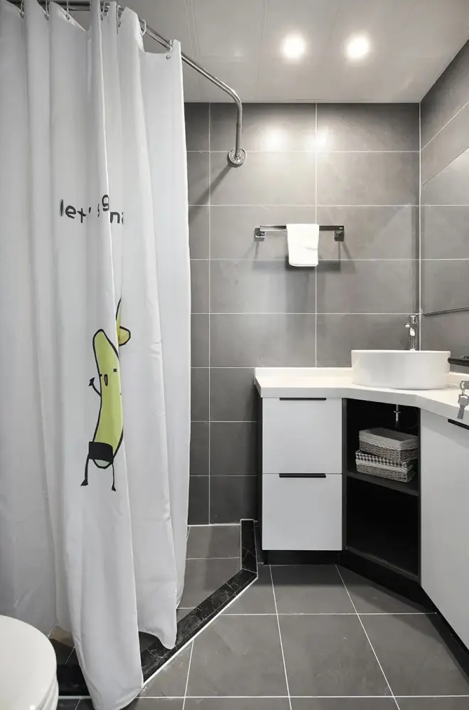 ▲卫生间稍小的空间,在灰色仿古砖的墙面地面空间基础,加入一个L字形的定制洗手台柜,搭配浴帘的设计,让小浴室也实用方便。