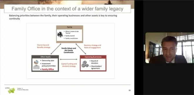 2023年7月14日(周五)下午,IfFP财富管理专业培训中心邀请Symon Tilberis(西蒙·提尔布里斯)老师,为大家带来【2023年中瑞财富管理展望系列专题讲座--家族治理】线上专题分享。本场讲座由IfFP 瑞伯职业技能培训(上海)有限公司CEO钟女士主持,首席学术负责人Felix Horlacher院长发表开场致辞。Felix院长分享道:企业家的成功往往以牺牲家庭为代价,这在前期可能取得一定效果,但也为后面代际传承埋下风险。因此,家族办公室服务人员重点要将家族内部治理做好,明确家族决策流程等。今天研讨会特别邀请了Symon 老师也将为大家重点分享家族治理的一些核心理念。