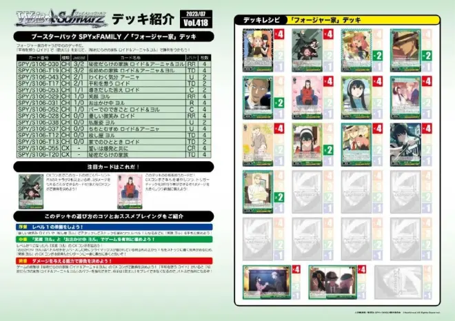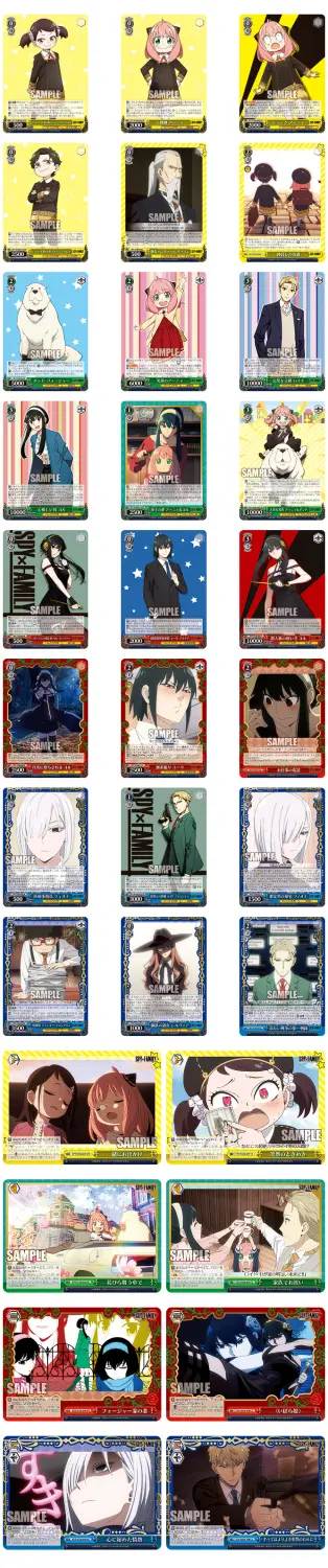 预组同样继续收录平行闪卡,其中包括4种SP烫金闪卡。补充包的收录卡不但能够强化同时发售的预组,也能单独构筑卡组,收录6位角色总共9种类的全新立绘,还会收录「间谍过家家」系列独有的特别稀有度SPYR(スパイレア)和其他高罕闪卡!