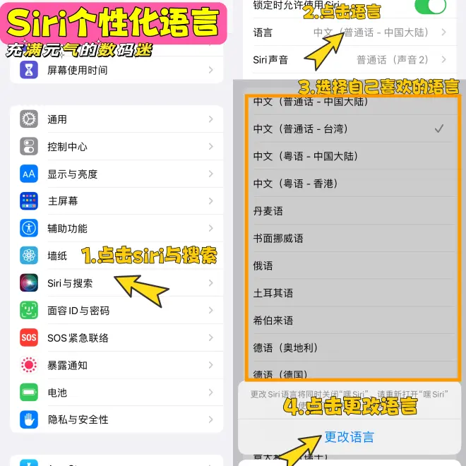 siri基本是每个iPhone用户必备的功能,但默认的语音听多了难免会腻,今天教大家换种风格👇 1⃣️设置- Siri与搜索-语言-选择自己喜欢的Siri语音-更改 2⃣️开启唤醒Siri-点击继续-按照要求完成Siri设置 🌈这样设置完的Siri更加有趣,学会的朋友们快点去试试呀👏(我是充满元气的数码迷,也欢迎朋友们点赞关注和分享🙆♂️)