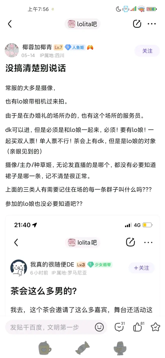 姐妹们,一定要避雷这个成都的lo茶会,茶会那天现场来了大量圈外男生来这里 这个茶会邀请了这么多嘉宾,舞台还活动这么多,一开始我也被这么大的规模吸引了,结果一进去看,各种疑惑操作。主播说这茶会dk能进,lo茶会啥时候dk能进去了?和漫展有啥区别?有个观众问裙子,这个主播竟然说不知道。圈外的看直播, 主播赶人竟然。你们看我截图,就这个镜头,出现好几个男的,还是常服,舞台有互动情节,这群男的竟然查手机去回答问题,结果礼物还给了,到了走秀情节,BGM放的还是军宅的歌,exm???互动情节更搞笑,问的都是低级的Lo圈问题,来的人竟然没一个回答上来的,还让男的上台答题。我不得不怀疑这个茶会到底在干什么?作为主办搞得这策划啥意思?不知道有男的伪装?谁知道男的了解lo不? 目前这个直播还在进行,大家进去一定能听到,这个主播就是主创,她边直播边和一旁男的聊天。如果是工作人员,一两个就够了,摄影一两个,结果这么大茶会来这么多男的,主办还和他们嘻嘻哈哈,真的降低了Lo的品格,到时候发生Ws男事件的时候,主办经典推责任,我在好奇这样的主办只负责流量,干嘛要挂爱好开茶会,真的为了爱好吗?如果为了爱好不清楚什么叫受众群体吗?我们Lo的活动都是圈内组织,来的都是圈内人,根本不需要当作文化输出,啥时候这么开放了,给商场路人卖门票随便进,总之我是避雷了,来嘉宾做签售,小小耶达都能来,确定不是搞漫展?场地明显就是商场里面,就是包了个厅,如果只是商场开,我分分钟想挂嘀咕