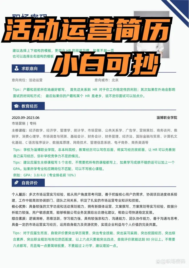 核心优势:具备较强的文字功底和活动策划能力,拥有新媒体运营、文案撰写、方案策划等实习经验,数据分析能力较强,用户敏感度高,能够根据公司业务发展给出合理化建议,帮助公司快速稳定发展。
