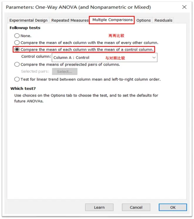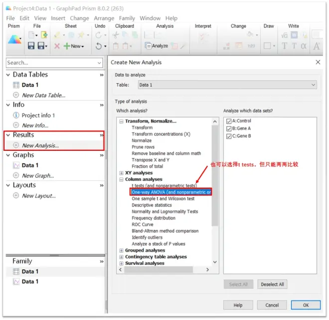 3.分析Step1:点击左边的Results中的New Analysis,选中Data1, Column analysis中的One Way ANOVA.