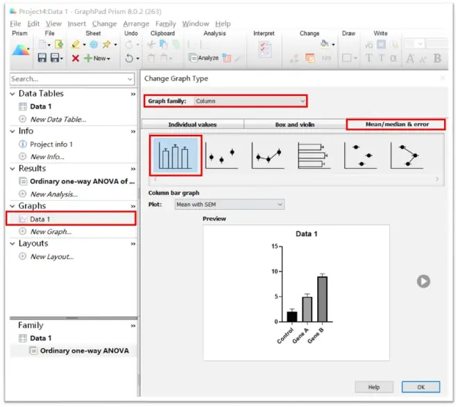 4.绘图①-Graphs点击左边Graph中的数据集Data1,GRaph family选择Column,按下图指示选择: