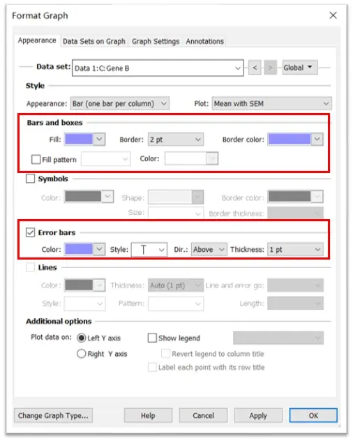 Step2:双击绘图区域,改变Bars and boxes(填充、颜色等)、误差棒Error bars等参数。